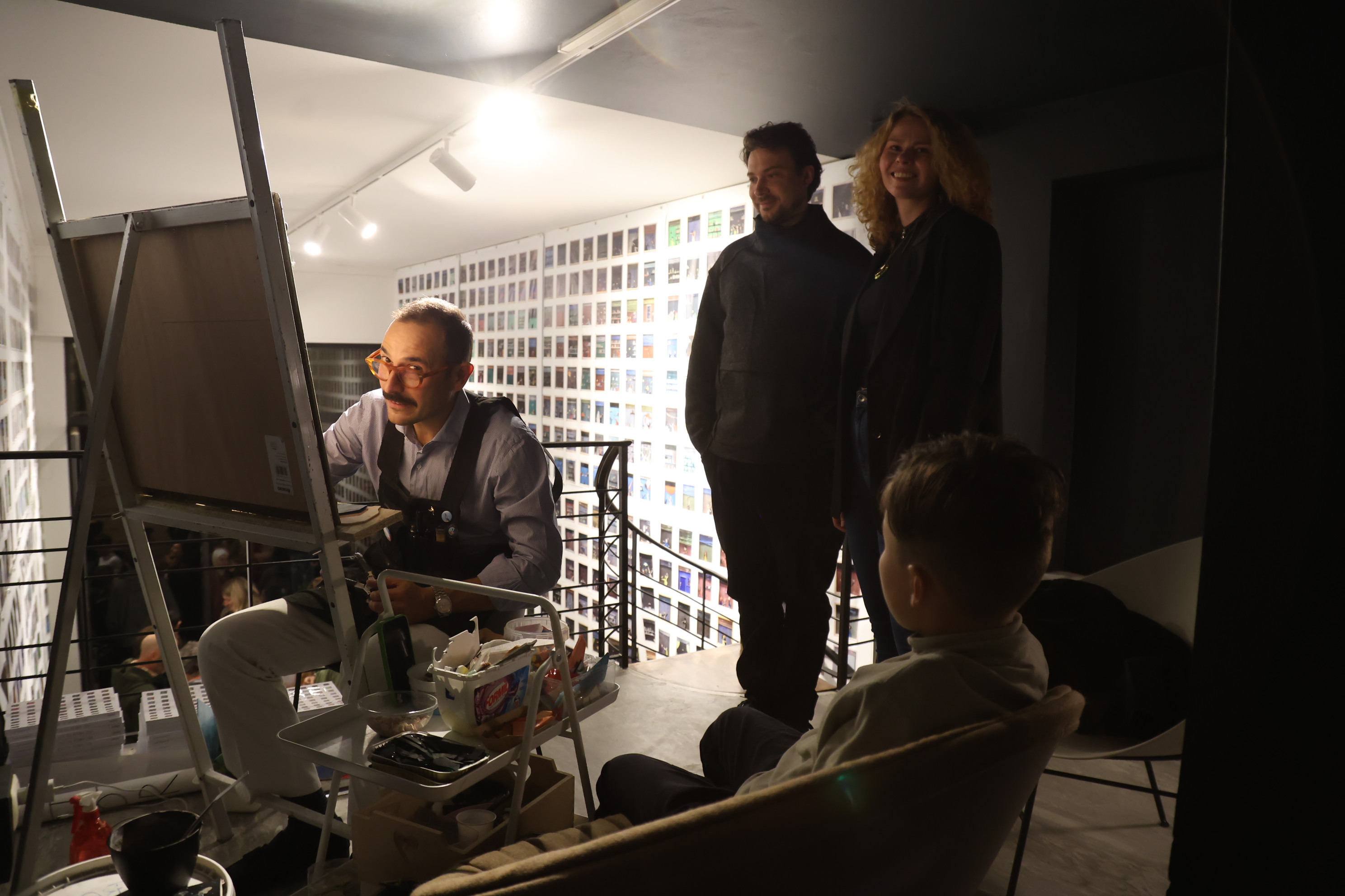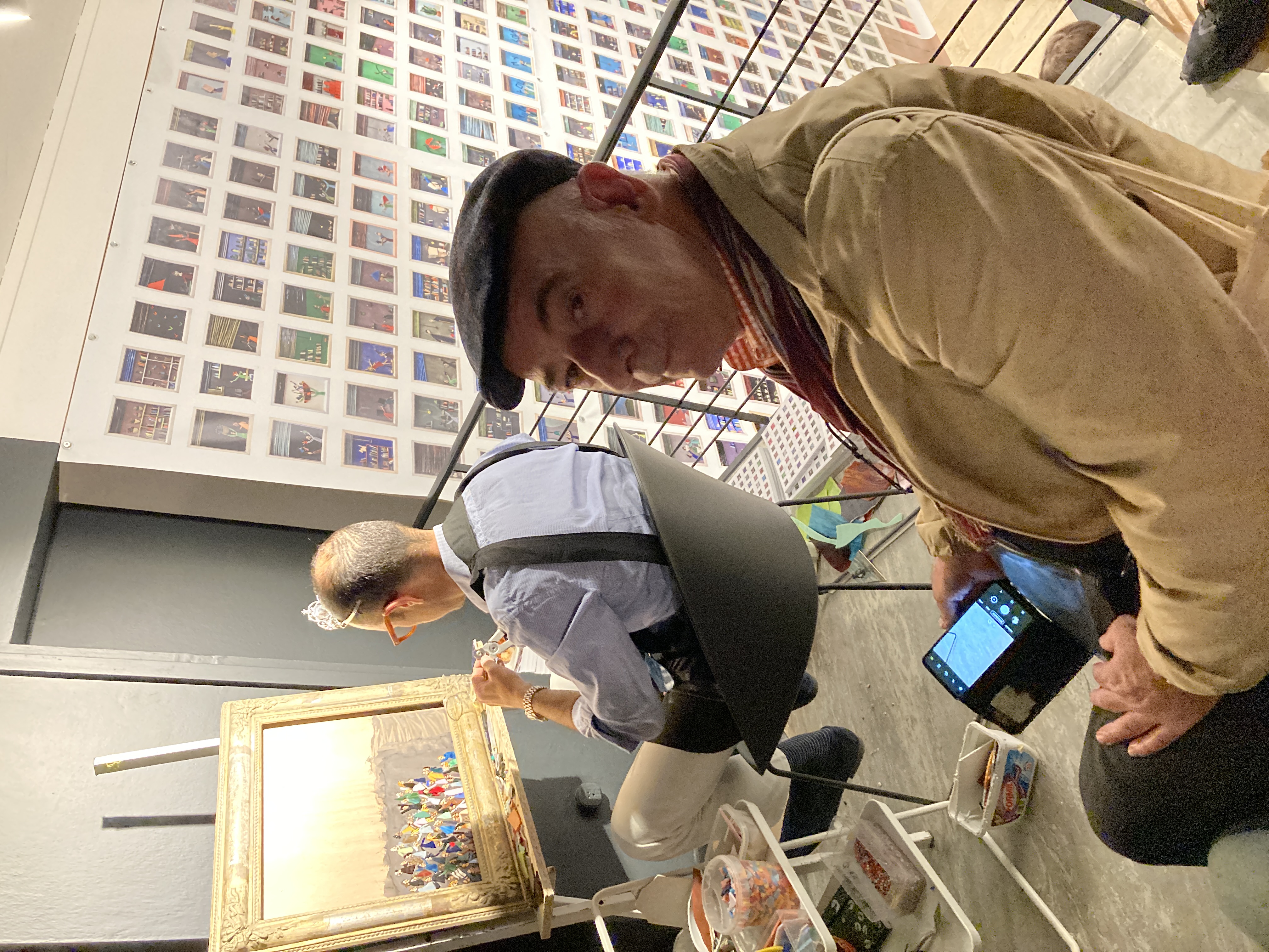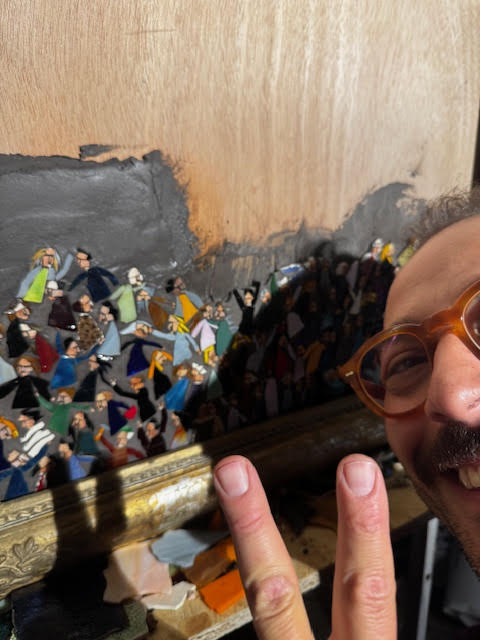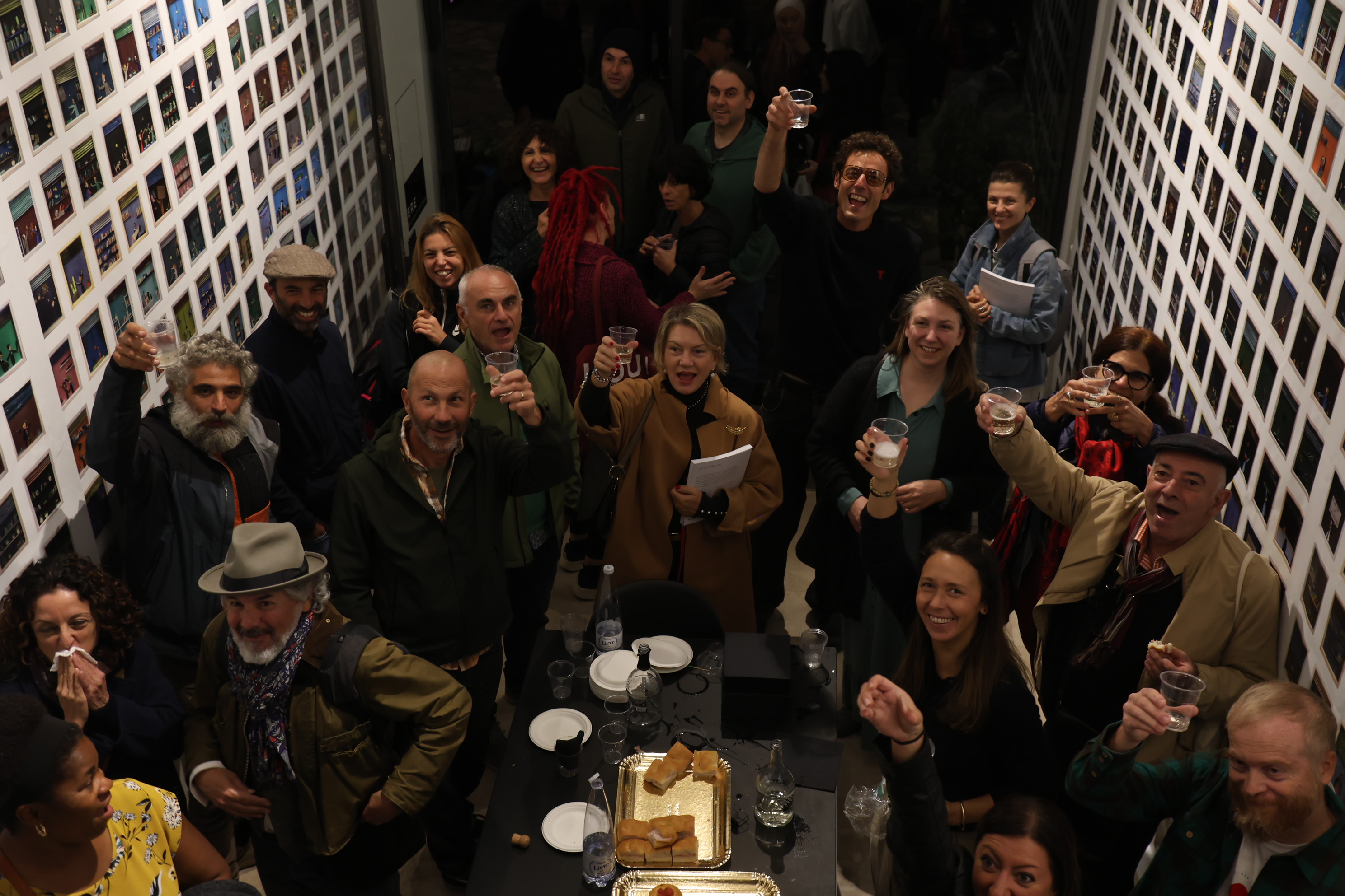 However, the creation of the mosaic follows a different and alternative path from the usual. Rather than sketching the characters of his animated crowds with the inventive spirit and iconic power that define him, Luca welcomes members of the public—one by one, diligently waiting in line for their turn (and nurturing the secret hope of winning a work of art)—to portray them and converse with them, so that the crowd is no longer anonymous but made up of real people, and the portrait becomes an occasion for sociality, a trigger for relationships.