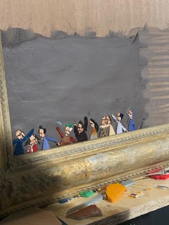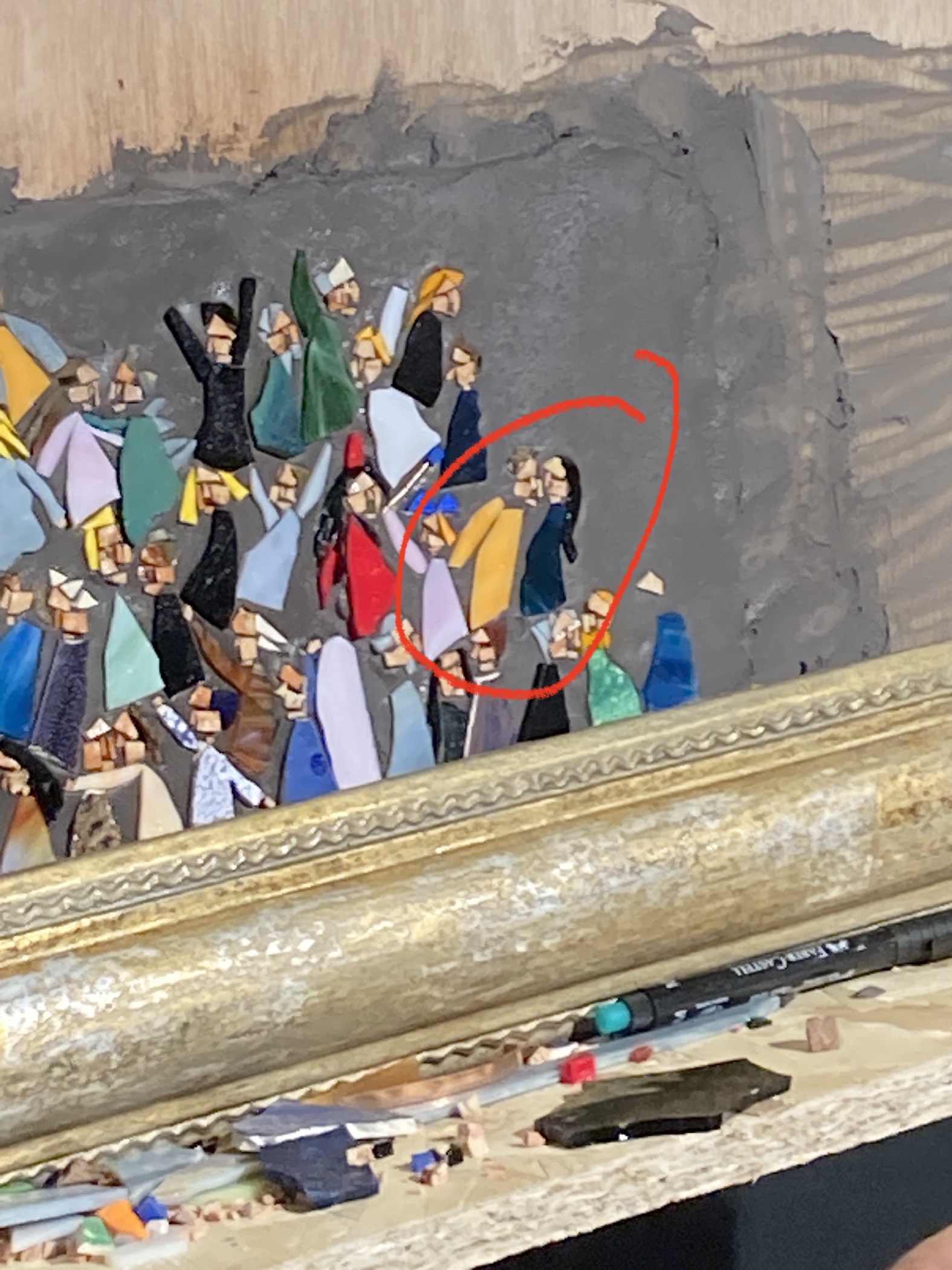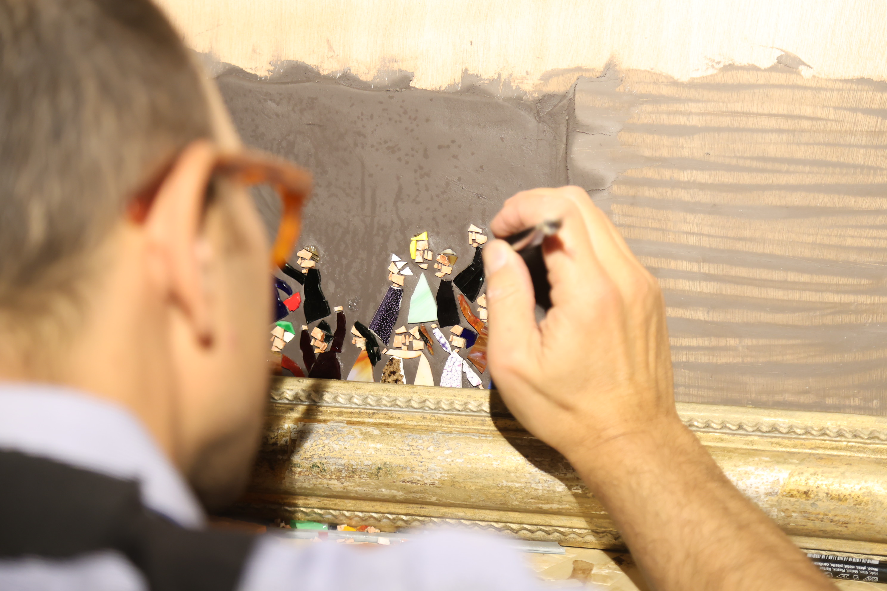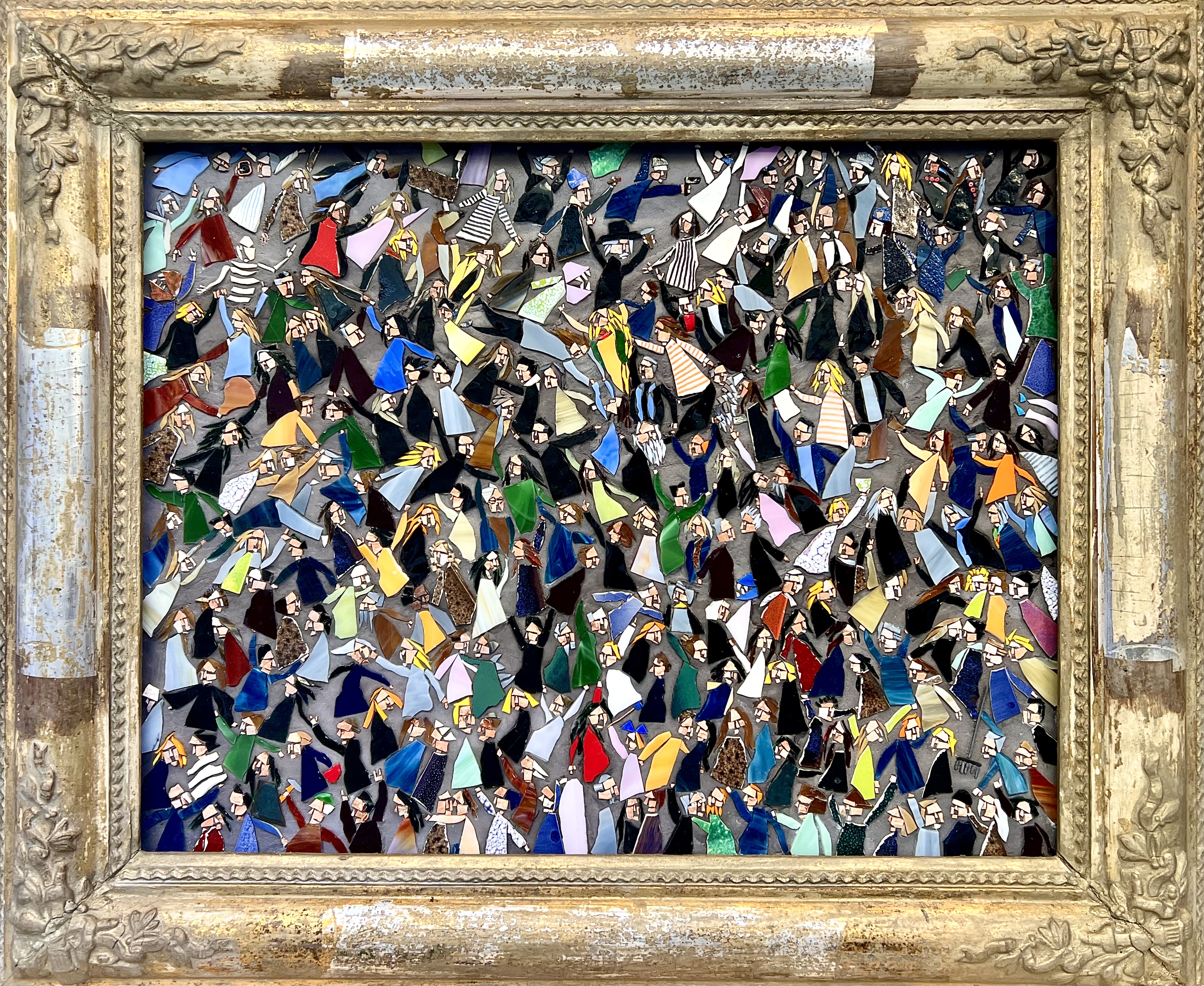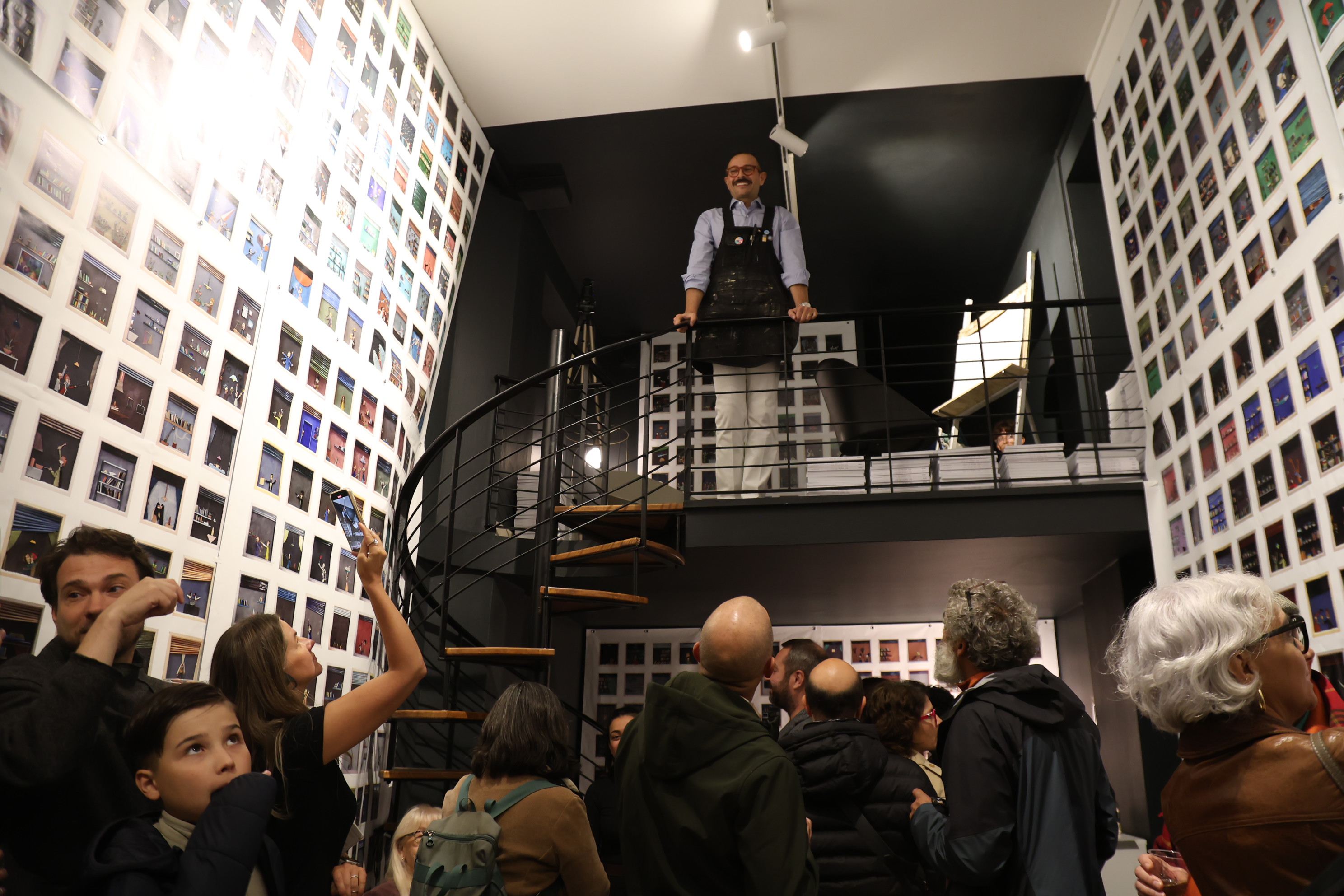 However, the creation of the mosaic follows a different and alternative path from the usual. Rather than sketching the characters of his animated crowds with the inventive spirit and iconic power that define him, Luca welcomes members of the public—one by one, diligently waiting in line for their turn (and nurturing the secret hope of winning a work of art)—to portray them and converse with them, so that the crowd is no longer anonymous but made up of real people, and the portrait becomes an occasion for sociality, a trigger for relationships.